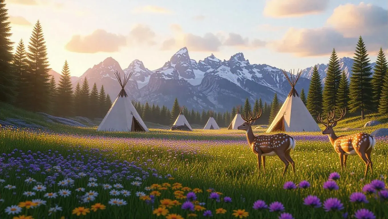A picturesque meadow bursting with vibrant wildflowers, where graceful deer roam freely among traditional teepees. Majestic mountains and towering pine trees dominate the backdrop, all set under a stunning sky with soft, wispy clouds and a gentle sunset glow.