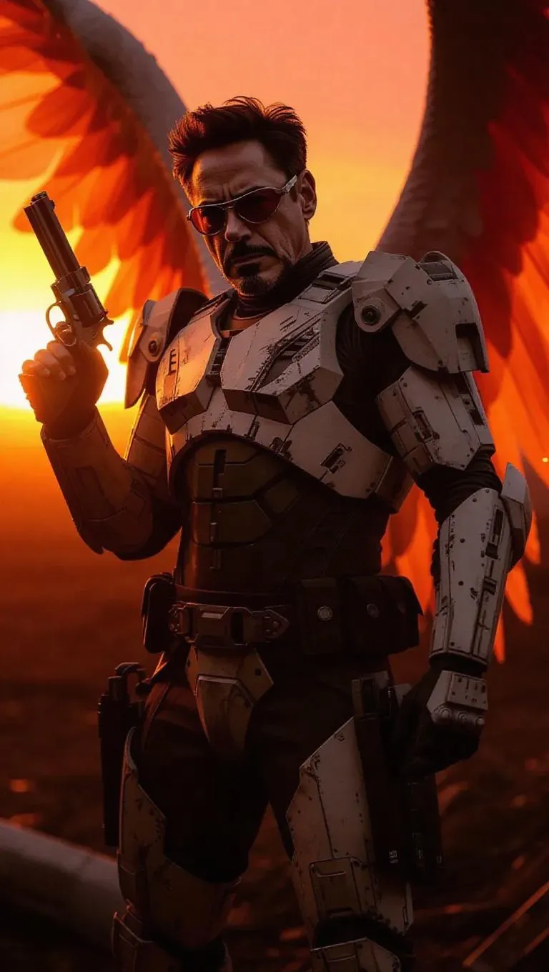 Create AI-generated art of Robert Downey Jr. as Uriel in post-battle chaos: angelic gunship wreckage, glowing ethereal wings, celestial revolver reload. Sunset-lit tactical gear, smirk, goggles reflecting battlefield mayhem. Perfect for AI-powered video/image generation with vivago.ai's high-quality effects. Ideal for sci-fi, fantasy creators seeking cinematic visuals from text prompts.