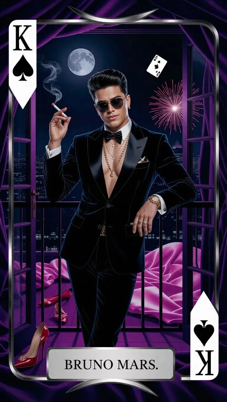 K♠ – Bruno Mars: Penthouse Player Styled in anime noir, card framed in obsidian chrome. Bruno Mars as the King of Spades — suave, dangerous, tailored in black velvet and gold chains. He leans on a balcony edge, cigarette glowing, shades reflecting the APT.’s nightclub lights. Pose: one hand in pocket, the other flicking an Ace of Spades into the wind. Behind him: open sliding glass doors with silk sheets tangled and a trail of red heels left behind. Hair slick, smirk lethal. Background: cityscape night, spotlight moon, faint sparks of fireworks. Card frame: deep black chrome, corners etched with gold spade icons, glitching slightly. Nameplate: “King of Spades – Penthouse Player” Vibe: temptation, dominance, velvet rhythm. ???? Matches lyric: “Sleep tomorrow but tonight go crazy”