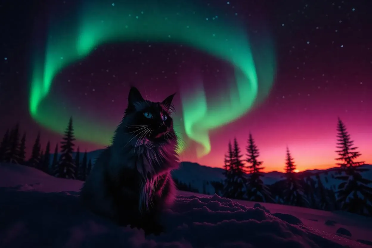 A Ragamuffin Cat transforms into the midnight aurora.