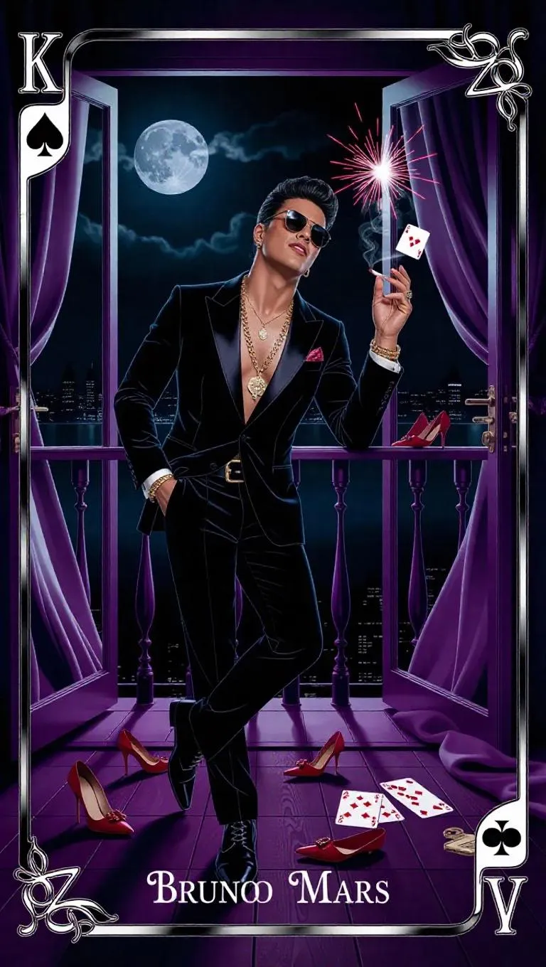 K♠ – Bruno Mars: Penthouse Player Styled in anime noir, card framed in obsidian chrome. Bruno Mars as the King of Spades — suave, dangerous, tailored in black velvet and gold chains. He leans on a balcony edge, cigarette glowing, shades reflecting the APT.’s nightclub lights. Pose: one hand in pocket, the other flicking an Ace of Spades into the wind. Behind him: open sliding glass doors with silk sheets tangled and a trail of red heels left behind. Hair slick, smirk lethal. Background: cityscape night, spotlight moon, faint sparks of fireworks. Card frame: deep black chrome, corners etched with gold spade icons, glitching slightly. Nameplate: “King of Spades – Penthouse Player” Vibe: temptation, dominance, velvet rhythm. ???? Matches lyric: “Sleep tomorrow but tonight go crazy”