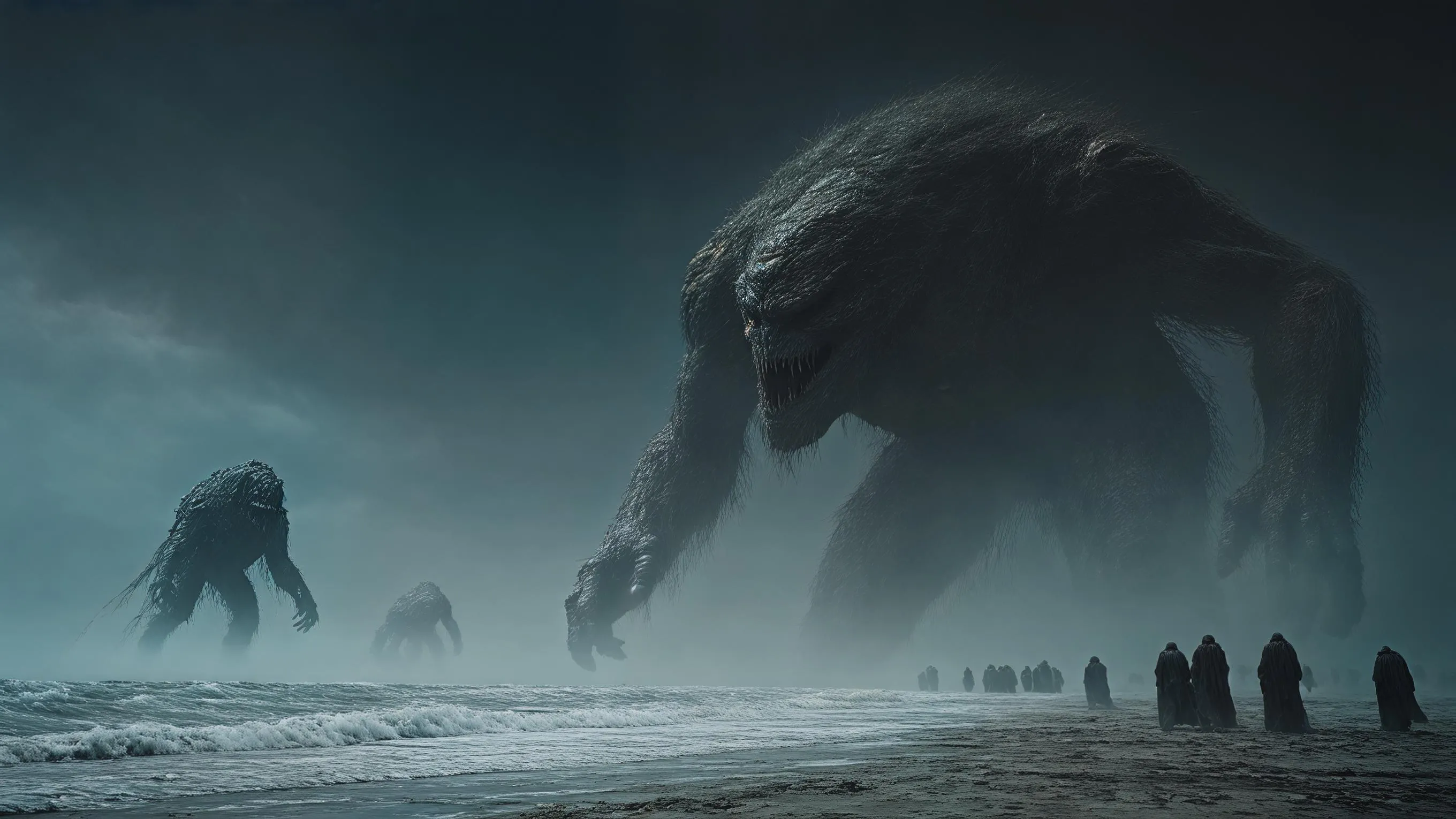 Create dark cinematic mythological art with vivago.ai. Generate AI images/videos of giant beings erased from reality, fading into dust and shadow. Depict a scarred, quiet world conveying necessity and finality. Professional AI effects for stunning 16:9 visuals without text. Transform prompts into epic visual stories.