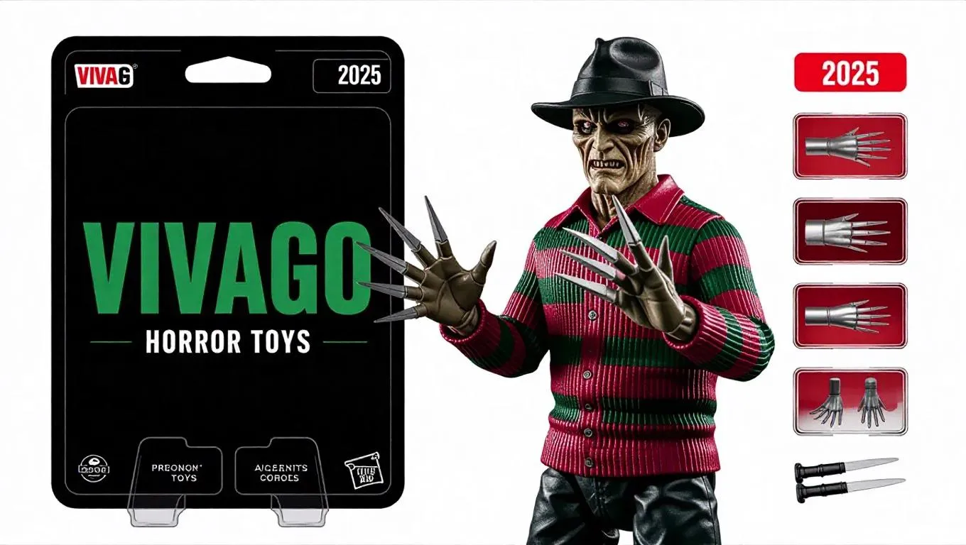 Premium collectible Freddie Krueger action figure with iconic bladed glove, rendered in photorealistic HD. Features serious expression, standing pose, and character-specific accessories in blister-pack compartments. Sleek black packaging highlights "VIVAGO Horror Toys" branding with green/white text and white "2025" label. Ideal for horror enthusiasts seeking high-def Nightmare on Elm Street memorabilia in premium toy collectible style.