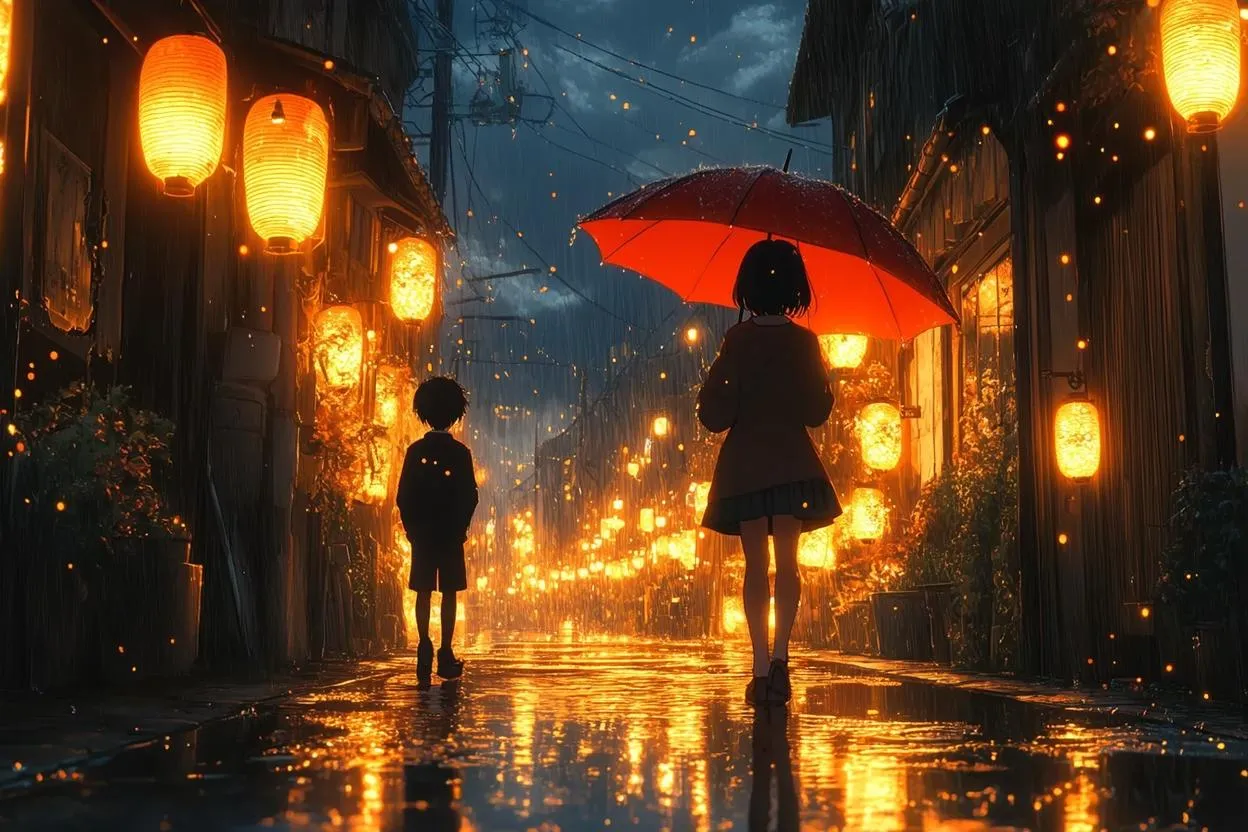 Create a Makoto Shinkai-inspired anime scene with AI: rain-soaked alleyway, glowing lanterns, and emotional farewell. Cinematic over-the-shoulder perspective, reflective wet pavement, dramatic sky gradients, hyper-detailed backgrounds. Perfect blend of nostalgic watercolor aesthetics, luminous droplets, and AI-generated cinematic lighting for evocative storytelling.