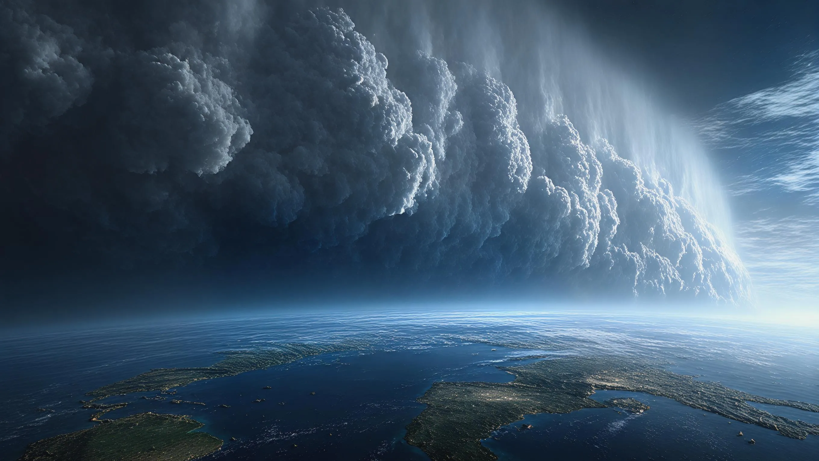 Visualize an apocalyptic planetary storm engulfing Earth with massive dark clouds. Experience AI-generated visuals of immense scale: helpless continents, dark cinematic atmosphere & imminent erasure. Create transformative, epic 16:9 visuals with VivaGo AI's image generator. Experience creation at cosmic scale. Explore AI-powered visual storytelling. (Word count: 49)