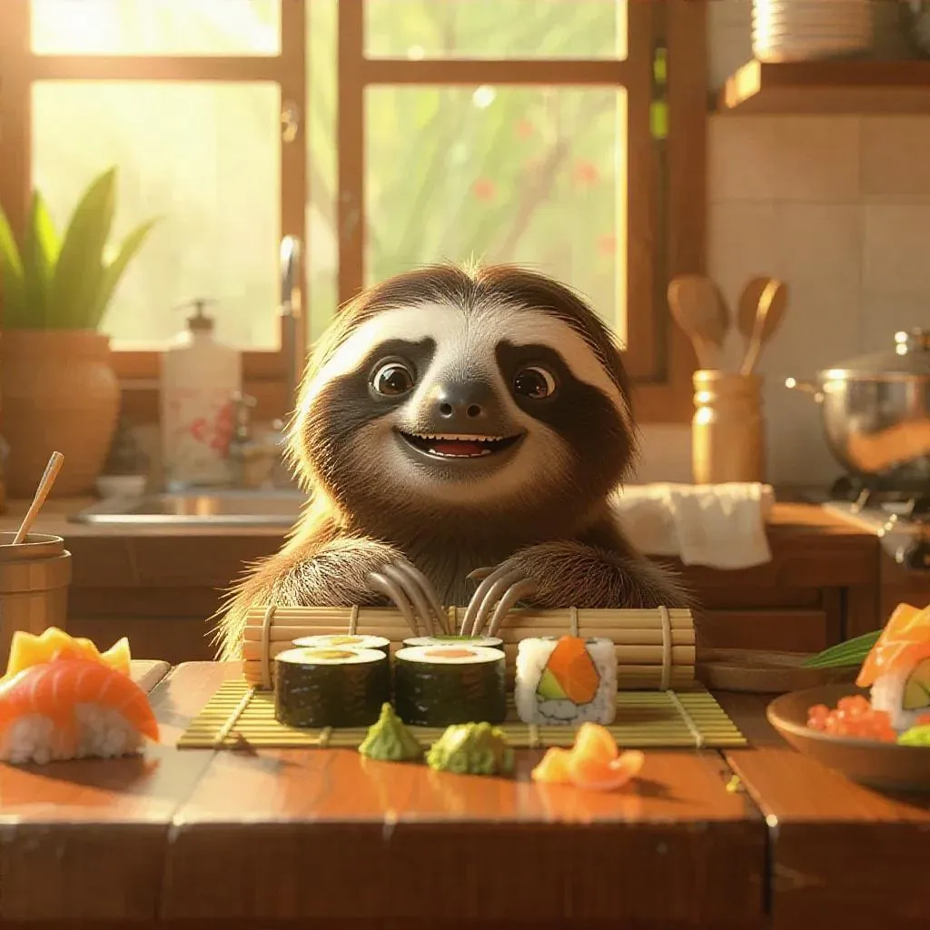 Create an AI-generated video of a playful cartoon sloth crafting vibrant sushi rolls on a bamboo mat. Fresh ingredients and cheerful vibes fill this exotic kitchen scene. Watch the camera glide from the sloth’s focused face to its meticulous assembly, highlighting fluffy details and colorful sushi artistry in professional-grade AI visuals.