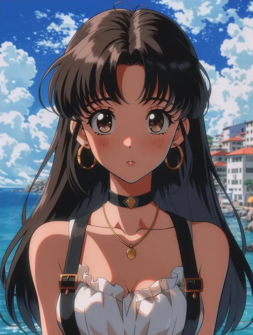 Generate 1980s anime GIFs in Hayao Miyazaki's style with vivago.ai. Create a black-haired, Barbie-like girl with aristocratic aesthetics against a seaside city backdrop. Get UHD animations featuring intense close-ups and iconic pop culture references. Turn text prompts into professional animated visuals instantly.
