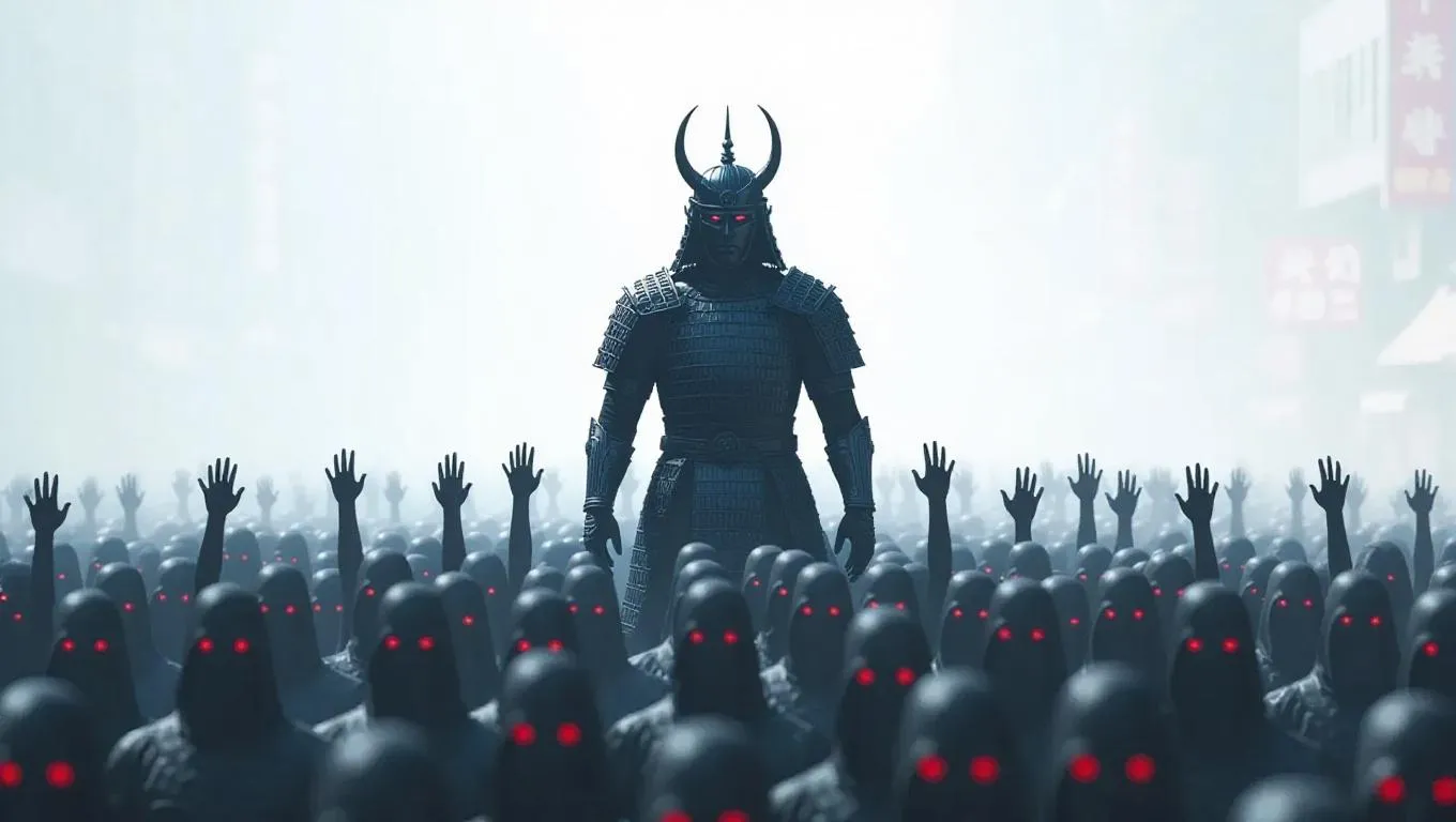 Discover AI-generated art contrasting an ancient warrior's noble silhouette against a dystopian crowd with masked, red-eyed figures. Create this symbolic visual using advanced AI tools for powerful storytelling imagery emphasizing beauty versus darkness. Perfect for evocative digital art concepts. Experience unique AI effects with Vivago.ai.