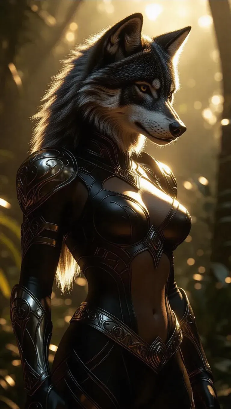 Create AI-generated fantasy-realistic art of a wolf-warrior hybrid with feminine strength, mystical tribal armor, and glowing energy symbols in an enchanted jungle. Vivid details capture her muscular anatomy, natural fur, and cinematic lighting for a magical, cinematic vibe. Perfect for AI-powered visual storytelling.