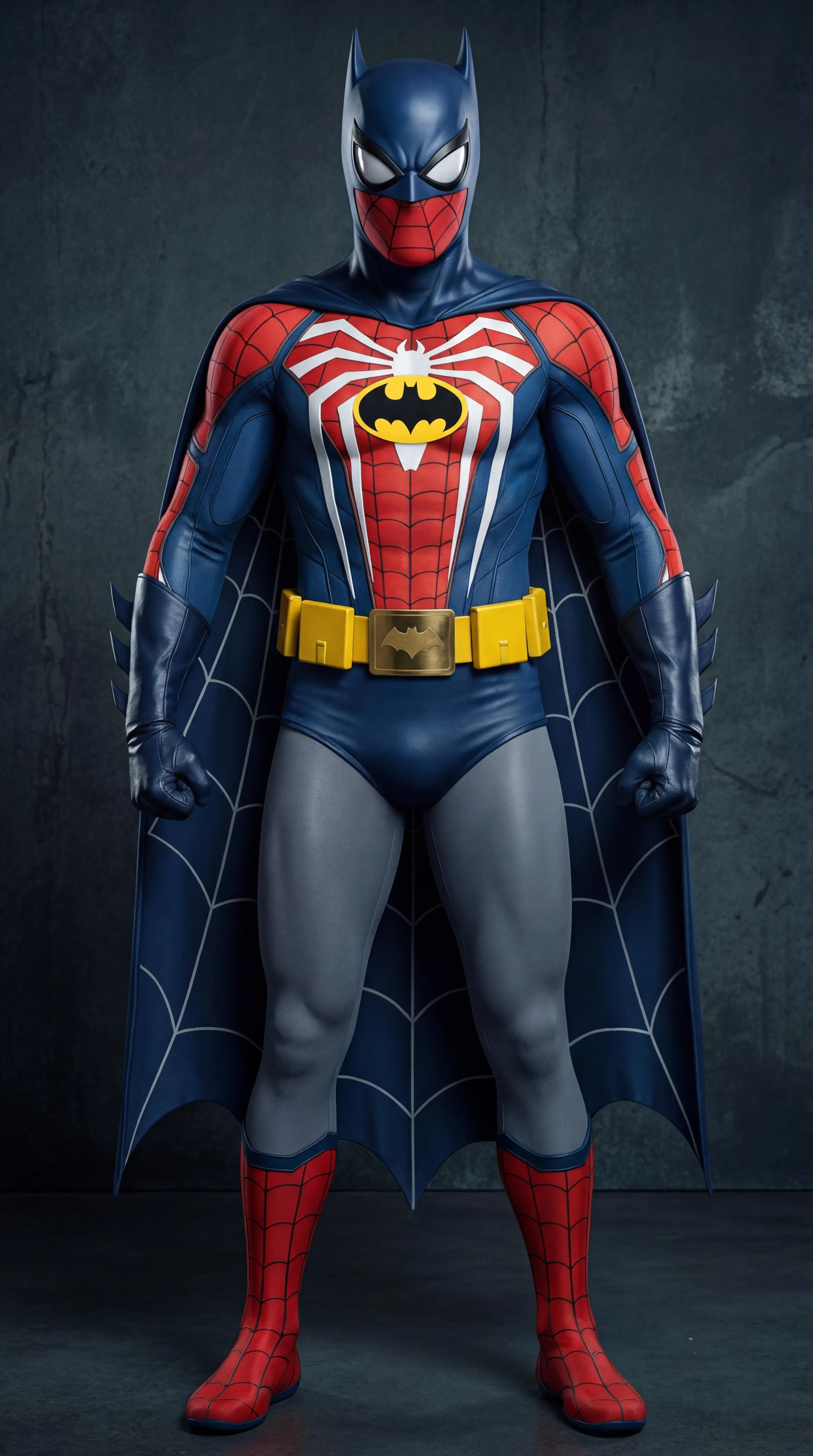 The Insomniac Spider-Man (voiced by Yuri Lowenthal) and Batman (portrayed by Adam West) interchangeably combine into each other as one to become Spider-Bat. The eye slits on Spider-Man's masks are in place of the eye holes on Batman's masks. The mouthpieces of Batman's masks are replaced by the lower parts of Spider-Man's masks. The front spider logos on Spider-Man's two suits are combined and merged with the front bat logos on Batman's two suits as one to form a spider-bat logo on the chest of the shirt. Batman's cape is instead split underneath his suit's arm pits like bat wings with white spider webs like Spider-Man's makeshift web wings. The utility belts on Batman's suits are combined and included. Spider-Man's shirts come with Batman's gloves. Batman's pants come with Spider-Man's boots.