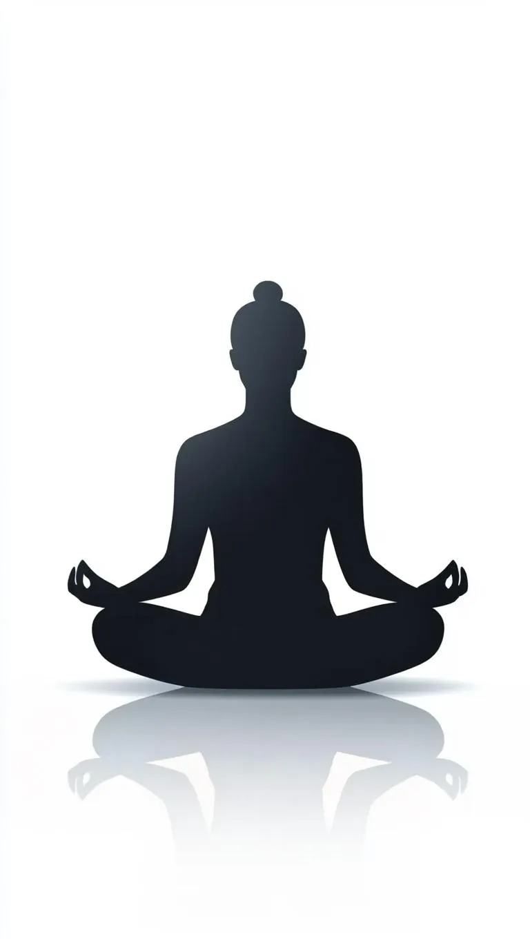 A serene silhouette of a person meditating, depicted in a minimalist vector style against a pure white background. The figure is seated in a classic lotus position, hands resting gently on their knees, eyes closed, and face serene. The environment is abstract, emphasizing the simplicity and tranquility of the moment. Soft, diffused lighting enhances the calm atmosphere, creating subtle shadows that add depth without detracting from the clean lines and minimalistic design. The overall style is clean and modern, ideal for illustrations.