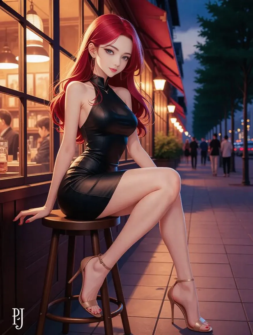 An anime style 30 year old Asian woman with long, wavy red hair sits gracefully on a wooden stool outside a warmly lit restaurant at dusk. She wears a sleek, form-fitting black mini dress that accentuates her elegant figure and nude high-heeled sandals. Her smooth, glowing skin contrasts beautifully with the moody, softly illuminated evening street scene. the background shows a city setting with large windows reflecting items in the background, trees lining the walkway, and groups of people strolling along the tiled path. She gazes calmly into the camera with a composed, alluring expression, creating an atmosphere that feels both sophisticated, intimate and sexy
