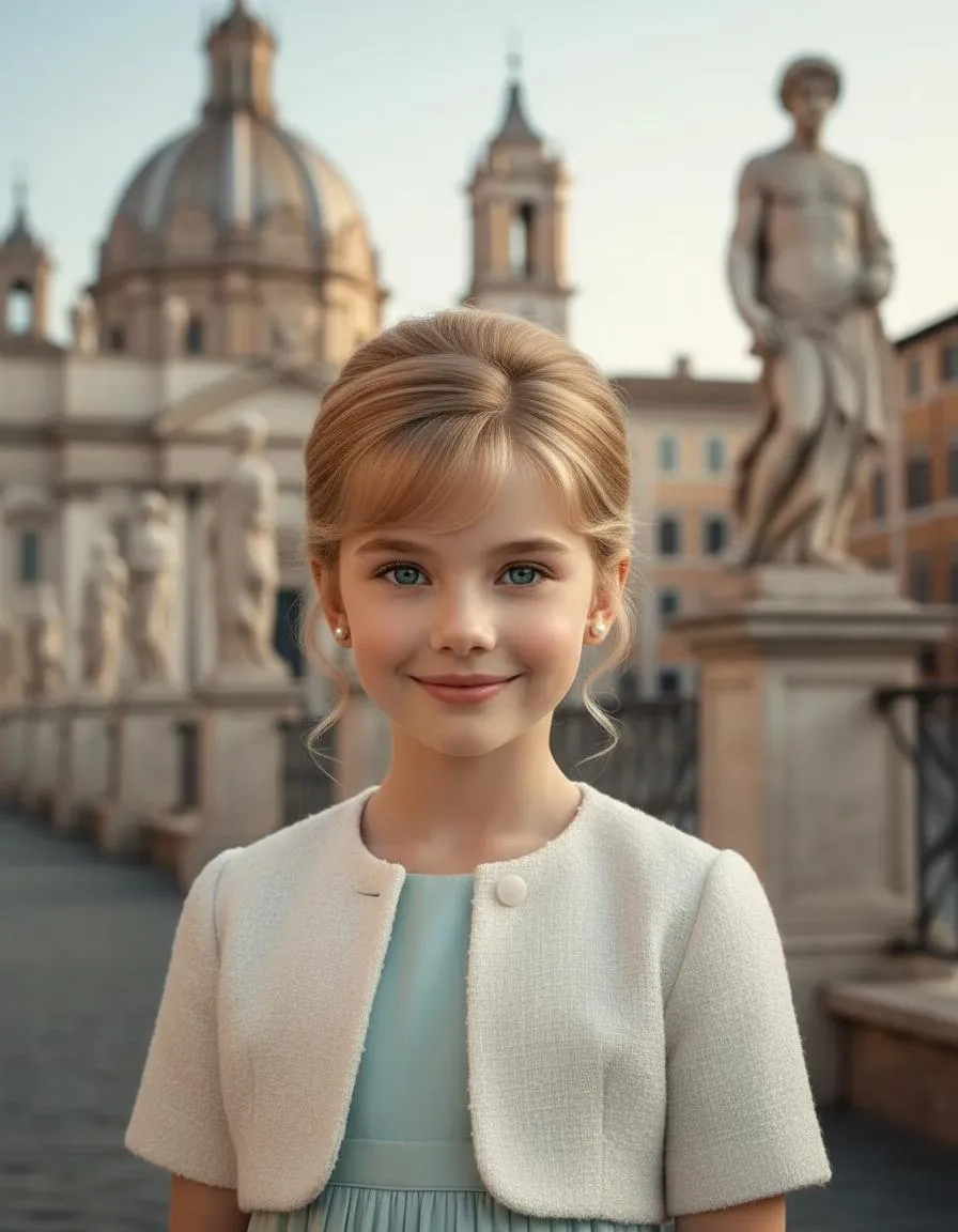 Create an Audrey Hepburn Roman Holiday-inspired child portrait with AI. Preserve the child's features. Generate a vintage outfit, pearl earrings, and vintage updo against classic Roman architecture in soft daylight. Achieve a timeless, cinematic elegance for refined child photography.