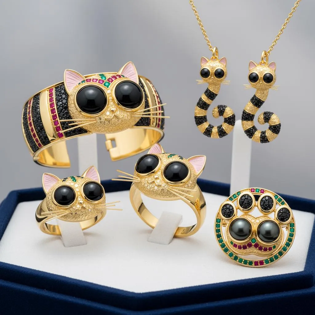 Create a jewelry collection of pieces inspired by the reference image of the picture symbol. The collection should include:Each piece should integrate elements of the picture. Designs should look elegant, luxurious, and detailed, with gold as the primary material, complemented by gemstones (e.g., emeralds, rubies, sapphires). Make sure each piece is distinct but visually connected as part of one collection.