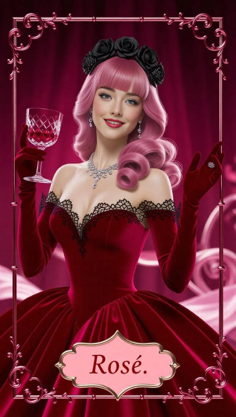 Full-length female figure of Rosé (Roseanne Park), styled in a red velvet gown with intricate black lace edges, her pink-blonde hair cascading in loose, lustrous curls. A delicate crown of black roses perches above her bangs. She gracefully holds a crystal wine glass filled with shimmering ruby liquid, her other hand elegantly raised as if mid-waltz. Her lips form a soft half-smile, and her eyes sparkle with romantic melancholy. Subtle 3D shimmer enhances the silk of her dress and the glass. Card frame: Crimson chrome frame adorned with baroque heart-shaped vines curling around the edges. The four corners feature stylized ♥ symbols crafted from intertwined rose stems. Background bathed in soft red clouds, with glowing petals gently falling, evoking a dreamlike perfume ad.