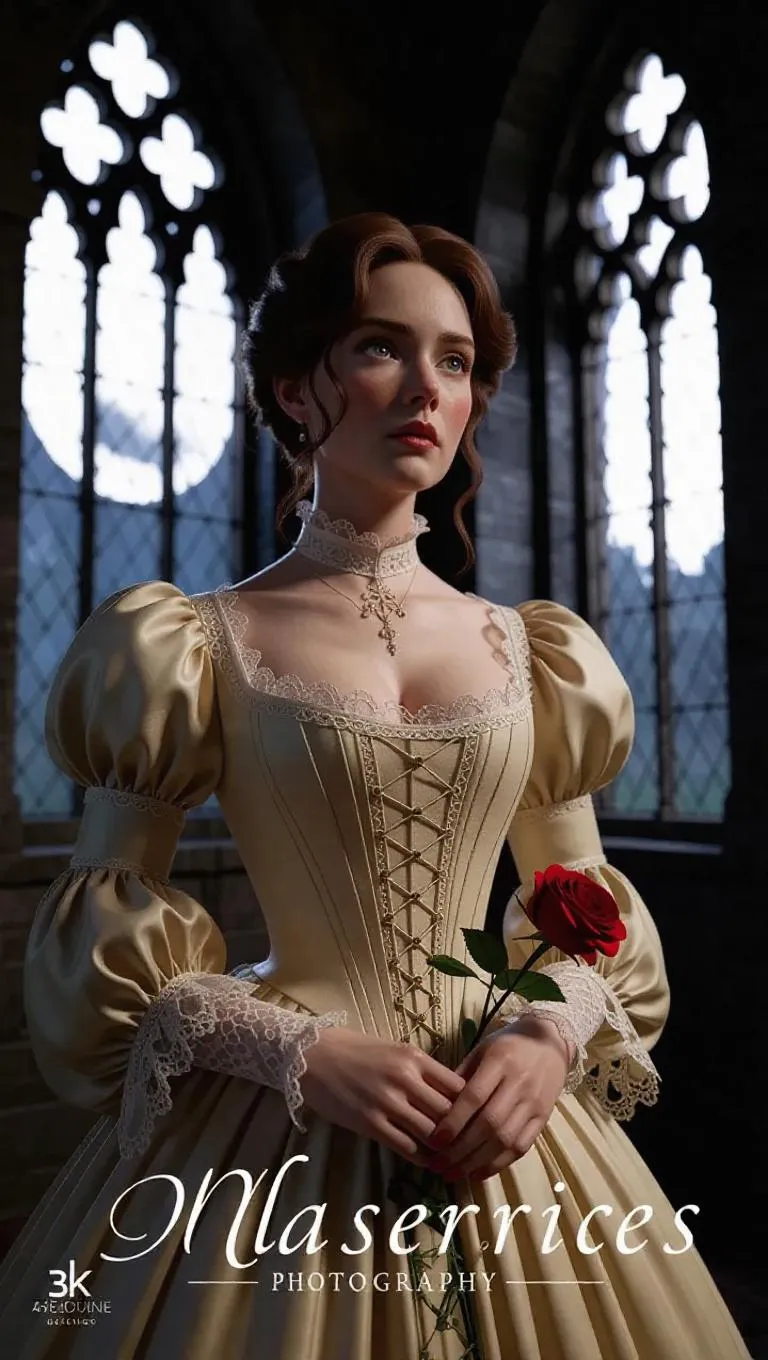 Create Gothic masterpiece AI visuals: detailed Victorian gown, haunting moonlight, blood-red rose against decaying elegance. Experience stunning 8K resolution with cinematic lighting, ultra-realistic textures, and Octane rendering. AI transforms beauty vs decay themes into breathtaking thick-painted CG scenes. Perfect for dramatic storytelling visuals. (58 words) *Focus keywords incorporated:* Gothic, Victorian gown, cinematic lighting, 8K, ultra-detailed, masterpiece, thick-painted CG, Octane rendering, light vs shadow, beauty vs decay, haunting, dramatic visuals, AI effect