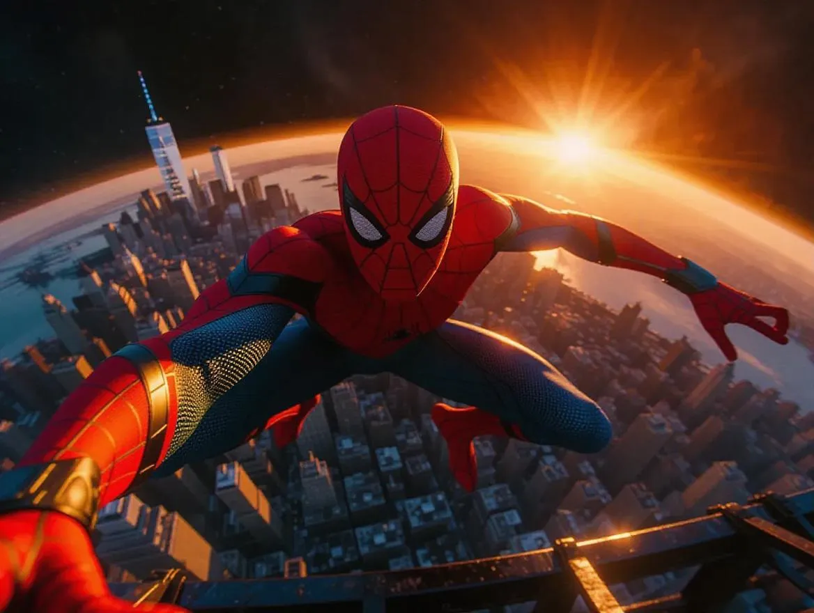Spider-Man soaring above a sprawling cityscape, gazing down at the entire world, globe in view, perfect physique, dynamic perspective, dramatic ultra-wide angle, fisheye lens, vibrant colors, dawn breaking, outer space horizon, atop a towering mountain, infinite expanse, sun rays piercing the darkness, staircase to infinity, uncanny realism, hyper-detailed, 32k resolution, inception-like layers, dark night, portrait photography, stunning beauty, reaching for justice, embracing peace, hugging the world, orange hues.