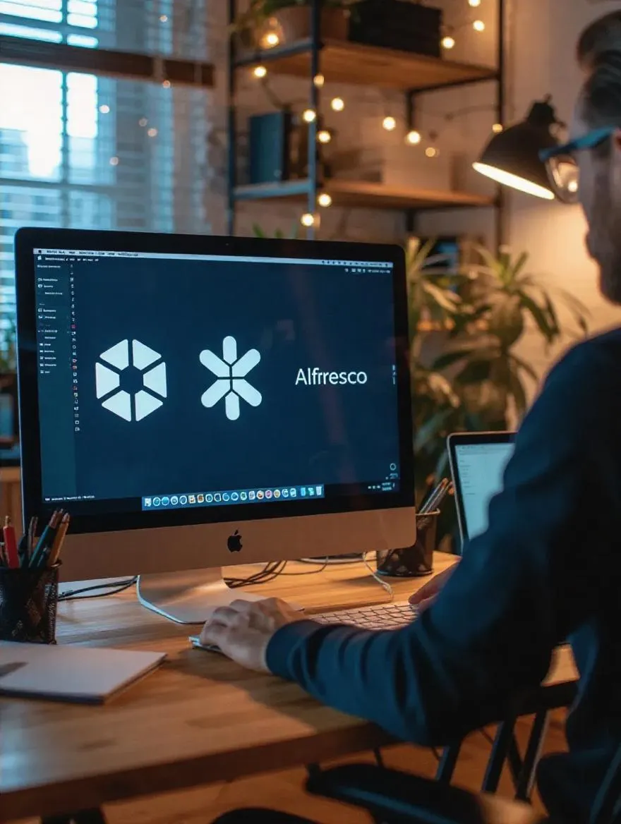 Generate AI images of a professional in an office setting with a computer displaying Alfresco and PMB logos. Create custom visuals instantly using Vivago.ai's AI tools for business scenarios and brand integration. Transform prompts into professional-grade imagery.