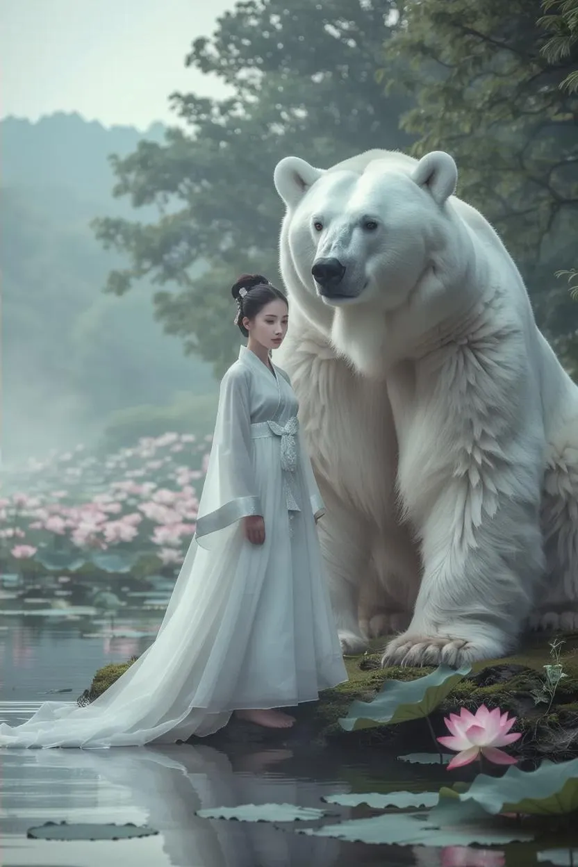 A hyper-realistic, cinematic tableau at the mist-veiled banks of a vast lotus-covered river. A barefoot Korean woman in a flowing, translucent white hanbok stands on mossy earth, ethereal and serene. Towering protectively behind her is a colossal white bear, its fur iridescent and thick like snow-draped silk, eyes wise and unwavering. Both gaze directly at the viewer, embodying harmony and quiet power. Mist coils upward from the river, where blush-pink lotus blossoms drift in clusters. The soft-focus background reveals a dreamlike canopy of lush foliage beneath a silver sky. The scene radiates sacred stillness, elegance, and folkloric wonder.