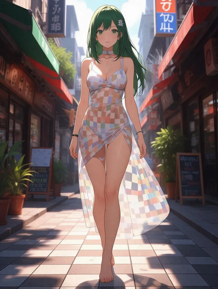Anime art of girl with green hair walks on street with googie building on pavement with checkered tiles in a transparent dress, see-throught dress, naked body, nipples, pose, figure outlines