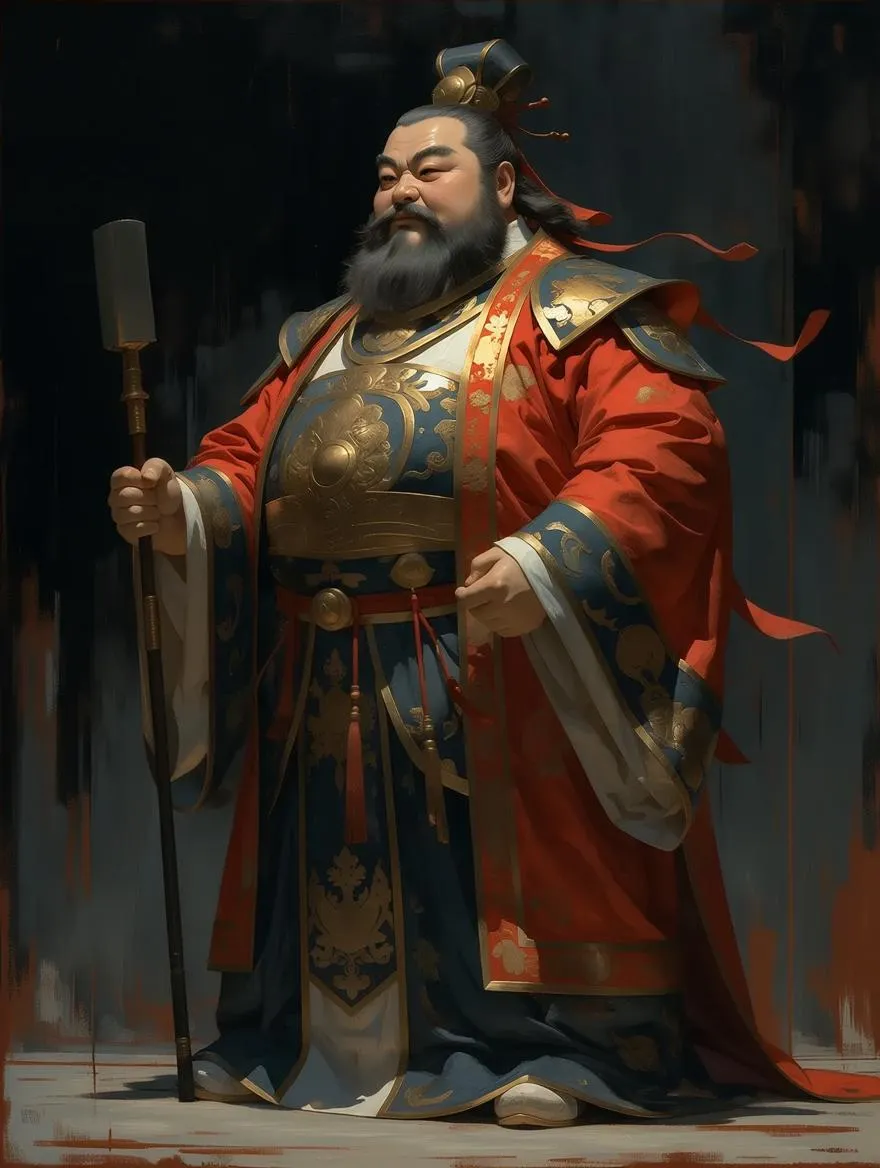 Fu Hu Luohan, traditional immortal-style clothing with giant body, exaggerated proportions, front, side, overhead perspective, exaggerated proportions, oil painting, acrylic paint, close-up, visual impact, thick application of oil paint with a scraper, rough, oc rendering, shallow depth of field, virtual and real layers, perfect light and shadow, flowing brushstrokes, high definition, master's work, the sense of paint smear and texture, the enhanced sense of artistic atmosphere, the fusion of background and foreground, darkness, the use of non-traditional composition methods, breaking the convention, oil painting.