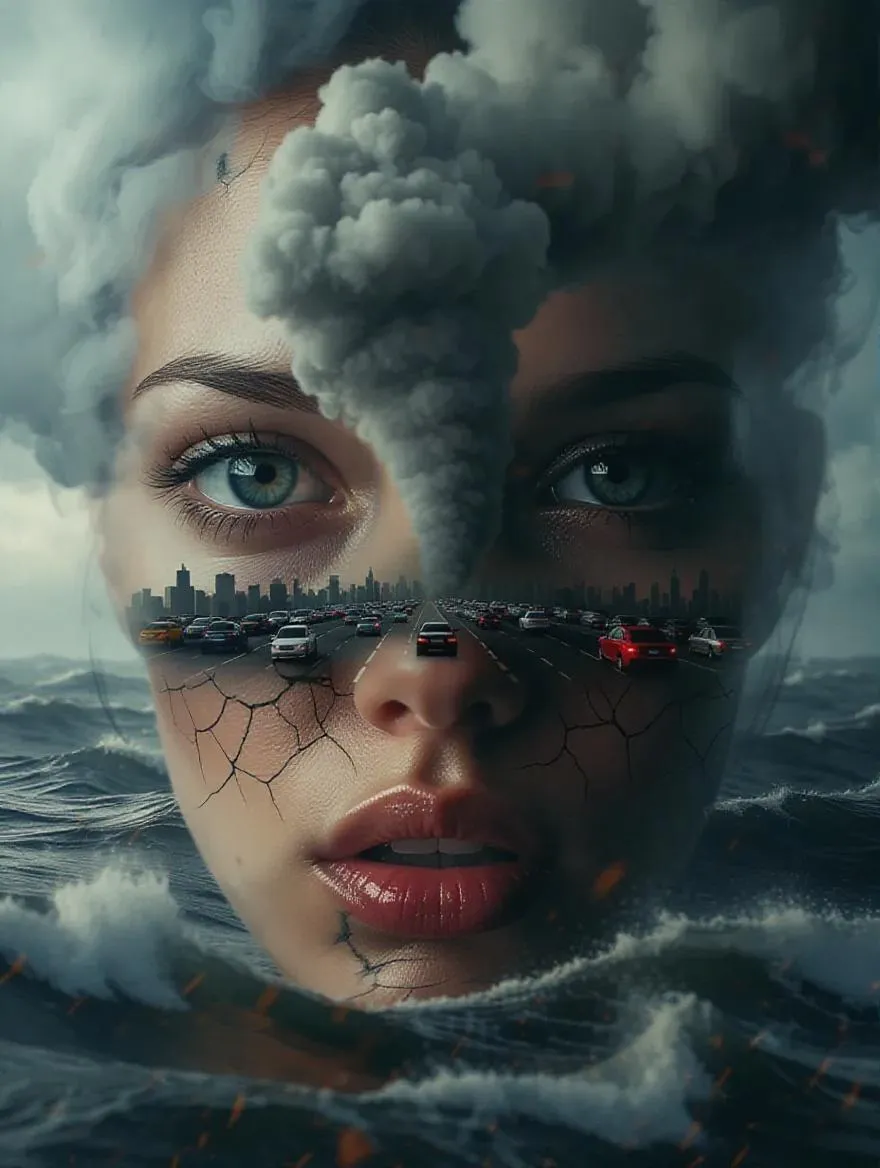 Transform text into surreal AI-generated art with vivago.ai. Craft a tornado-haired woman with fog eyes, dimensional cracks, and a highway erupting from her mouth. Set against surreal sea waves and ancient ruins. Explore AI effects for smoke, motion, and fantasy visuals. Elevate creativity with professional AI image tools for dynamic, ethereal, and hyper-detailed digital masterpieces.