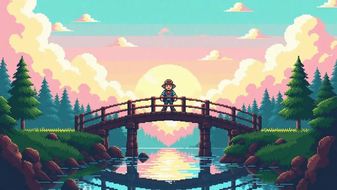 Generate retro pixel art visuals with AI: a pixelated character strolls across a bridge, blending nostalgic gaming aesthetics with modern AI creativity. Perfect for digital artists, game developers, and content creators seeking 8-bit charm. Explore Vivago.ai's tools for seamless AI image generation, retro effects, and professional-grade editing.