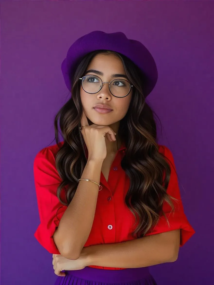Create AI-generated portraits like this Brazilian woman with light tanned skin. She wears glasses, a purple beret, red shirt, and long skirt. Capturing her long wavy hair and mischievous, puzzled expression as she looks thoughtfully to the side. Experience vibrant character art with Vivago.ai's professional AI generation tools.