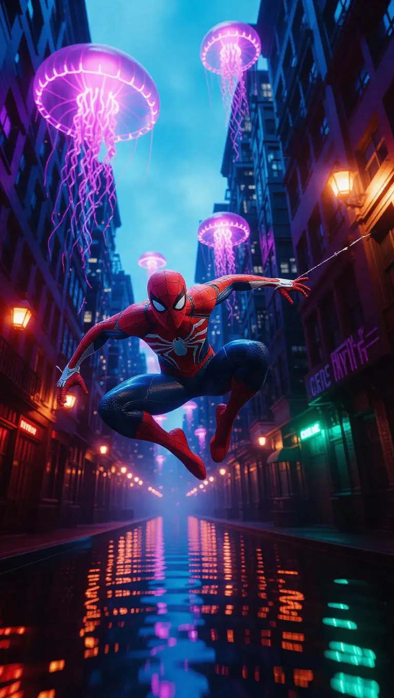 In an upside-down city, Spidey glides over rivers of liquid metal, surrounded by towering buildings resembling huge coral reefs. Encased in a translucent energy membrane sparkling with runes, his rainbow spider silk connects strange creatures. Huge jellyfish-shaped spaceships float, casting colorful light. Dreamlike colors, surreal elements, Octane renderer, UHD quality, mysterious lighting, thick CG style, high color saturation, no realism, no dull colors, no blurry edges, no plain urban backgrounds.