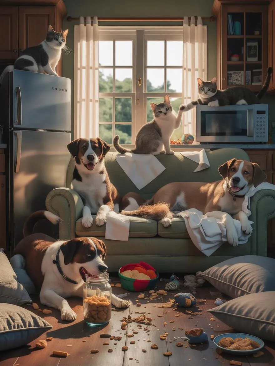 A highly detailed, hyper-realistic scene of a chaotic living room, with a group of dogs and cats wreaking playful havoc. One dog’s head is stuck in an empty food jar, while another lounges on a sofa covered in toilet paper. A cat, looking "innocent," perches atop the fridge, observing the mess, while another cat presses buttons on the microwave, trying to “help.” The floor is cluttered with toys, pillows scattered around, and food spilled. Natural sunlight streams through the window, enhancing the humorous, relatable chaos, evoking a lighthearted, everyday moment that every pet owner can connect with.