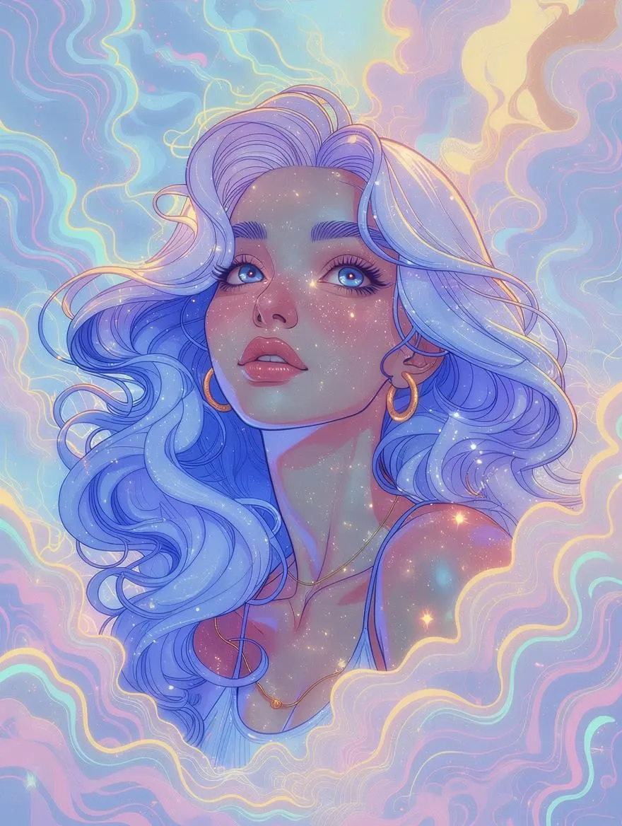 A UHD, centered cartoon-style illustration of a woman in a soft, hallucinatory dreamscape. She has wide eyes and a serene expression, surrounded by swirls of iridescent, glowy smoke. The scene is rendered in cel-shading with flat, low-saturation pastel tones, punctuated by bursts of vibrant neon. Pastel hues and soft motion effects blur the boundaries between thought and sensation, creating a surreal, euphoric atmosphere. Delicate and fluid ink lines add expressive structure, inspired by MSchiffer’s aesthetic. The artwork is airy yet vivid, blending splash art and dream logic with fine detail and radiant clarity.