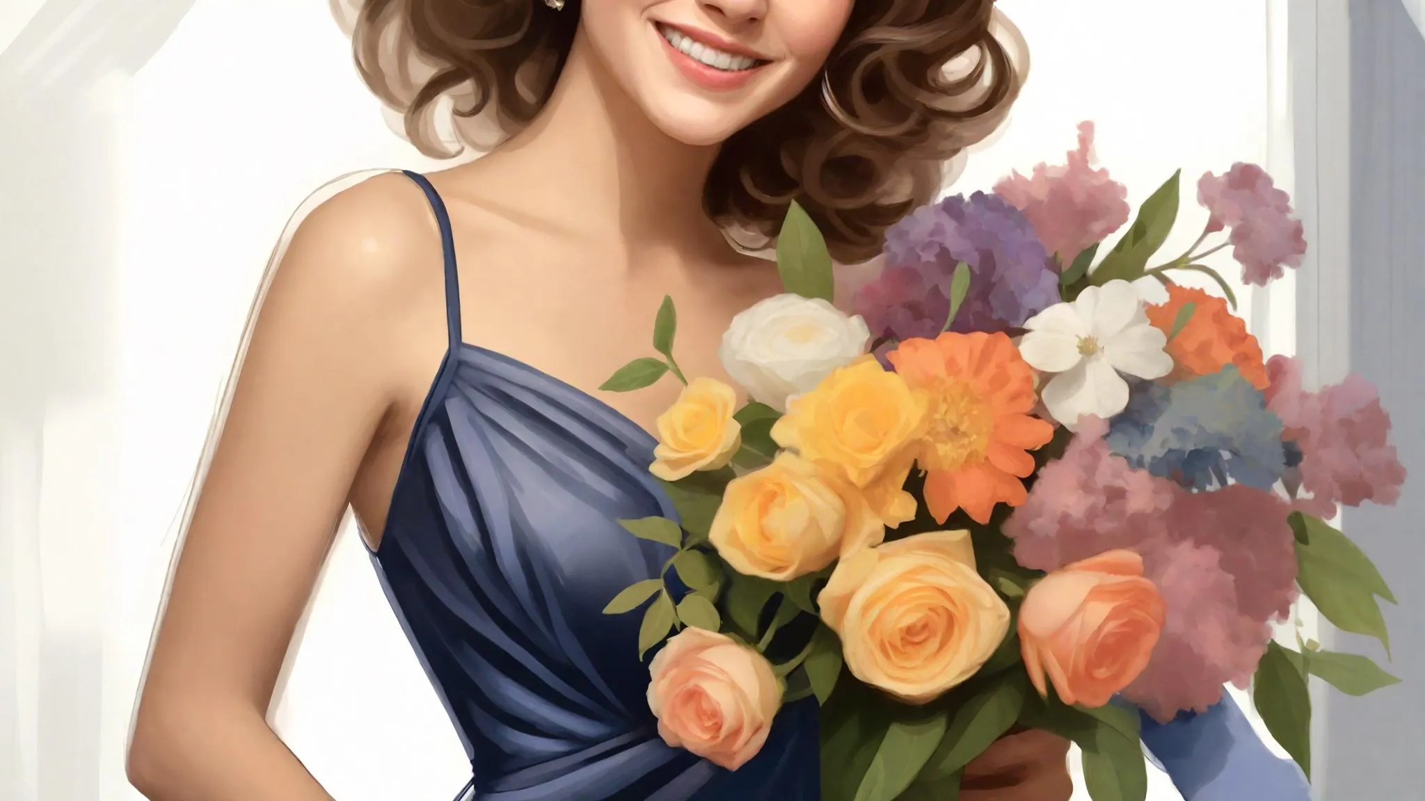 Create stunning AI fashion illustrations of a woman in a dark blue dress holding a bouquet. Generate detailed images featuring medium curly brown hair and a welcoming smile on a clean white background. Try our AI generator for elegant, airy portraits.