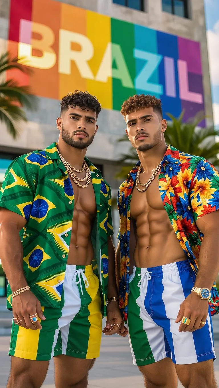 Generate AI photo of two muscular Brazilian men in vivid rainbow outfits, urban coastal setting with "BRAZIL" mural. Features photorealistic textures, dramatic rainbow lighting, gold jewelry & Brazilian flag colors. High-fashion photography style, detailed textures & AI-powered creation tools.