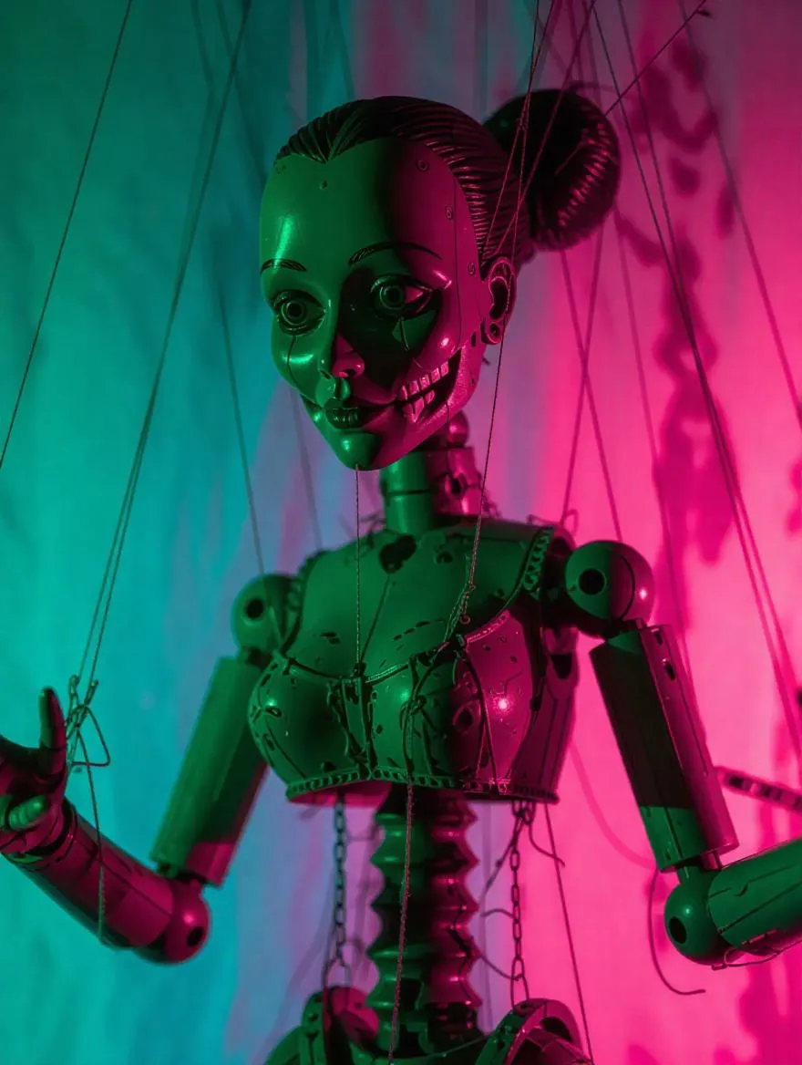 Marionette, spitegeist with a haunting green, brown, and pink color palette, intricate strings manipulating its movements, set against a dimly lit, eerie backdrop, exuding an unsettling and mysterious aura.