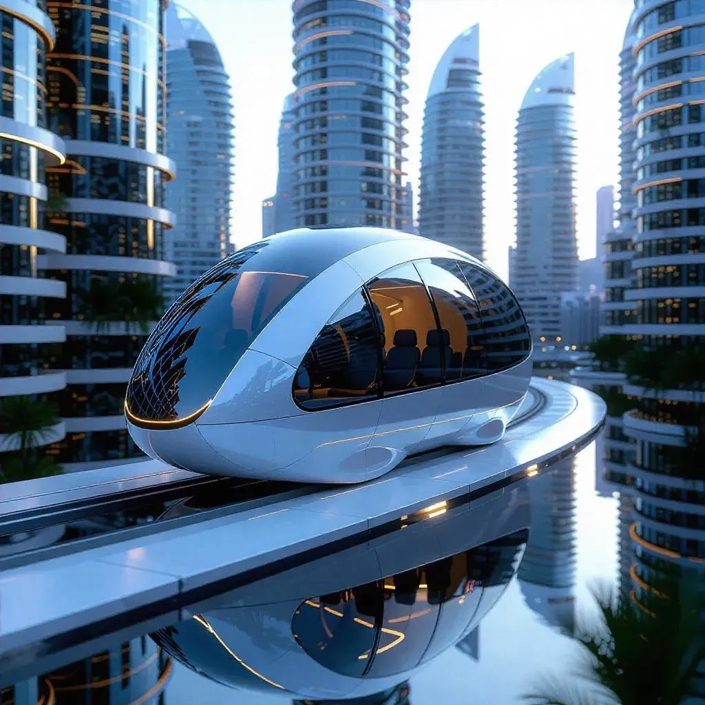 Explore a visionary AI-generated futuristic cityscape with magnetic levitation vehicles gliding past curved eco-skyscrapers. Vibrant colors highlight sustainable architecture blending tech innovation and ecological harmony. Features sleek transportation pods, luminous transparent designs, and dynamic urban landscapes. Create cutting-edge utopian visuals with vivago.ai's AI image generator for next-gen storytelling and concept art.