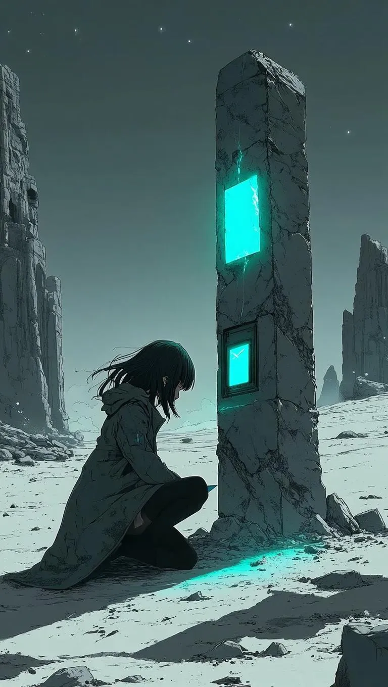 Explore AI-generated anime art with cinematic watercolor effects. Transform text into visuals of a solemn anime girl on a dark exoplanet, inserting a glowing letter into a crystal beacon. Rendered in slate grays, cyan glows, and celestial geometry—vivago.ai crafts professional-grade AI art from prompts, blending minimalist styles with ethereal, otherworldly storytelling.