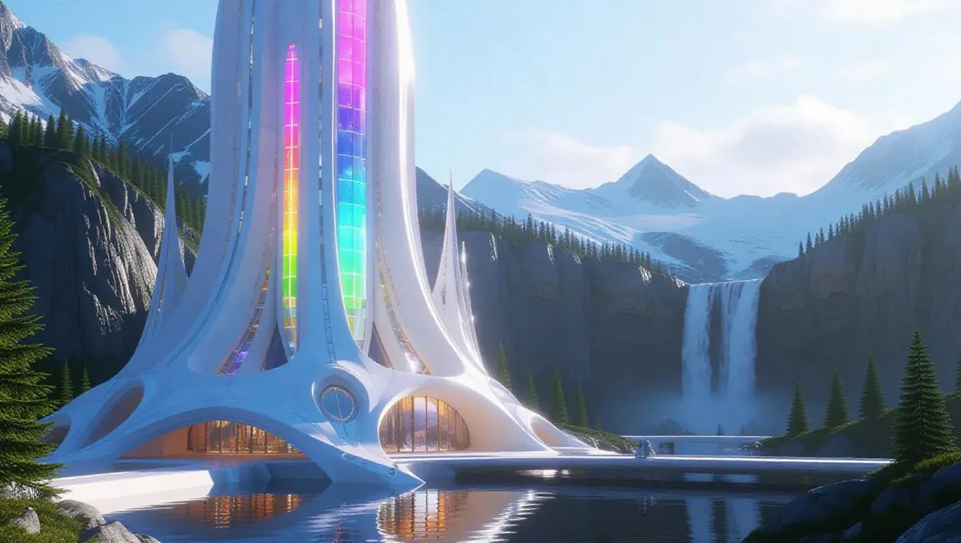 Generate a futuristic white crystal skyscraper with vibrant rainbow windows, set against serene mountains and a cascading waterfall. This AI-powered image blends modern architecture with fantasy, using natural daylight and rule of thirds composition for ethereal, harmonious visuals. Perfect for professional-grade creative projects.