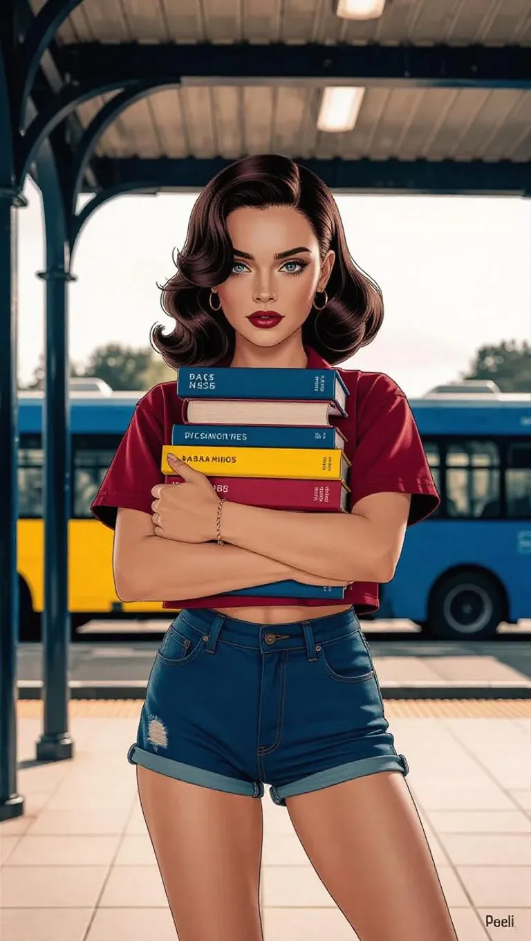 Generate striking punk comic artwork with vivago.ai's text-to-image AI. Turn prompts into vivid illustrations: dollfaced babe holding books at a bus station, flat printing texture. Featuring silvery white, dark blue, acid yellow, and maroon blur effects. Create unique AI graphics with professional editing tools now.