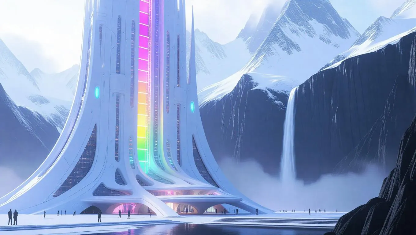 Generate a futuristic white crystal skyscraper with vibrant rainbow windows, set against serene mountains and a cascading waterfall. This AI-powered image blends modern architecture with fantasy, using natural daylight and rule of thirds composition for ethereal, harmonious visuals. Perfect for professional-grade creative projects.