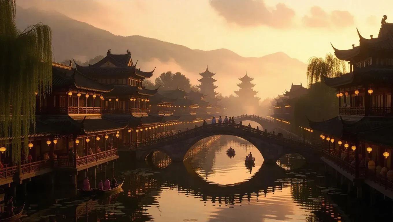 Experience AI-generated ancient Chinese splendor with bustling riverside markets, silk-robed nobles, and mist-draped willow rooftops. Anime-style shimmering canals, lotus-filled lakes, and lantern-lit pavilions blend traditional ink aesthetics with modern vibrancy. Vivago.ai crafts dreamscapes where poets, dancers, and golden osmanthus blooms thrive under sunset clouds—redefining tradition through New Chinese Style artistry.