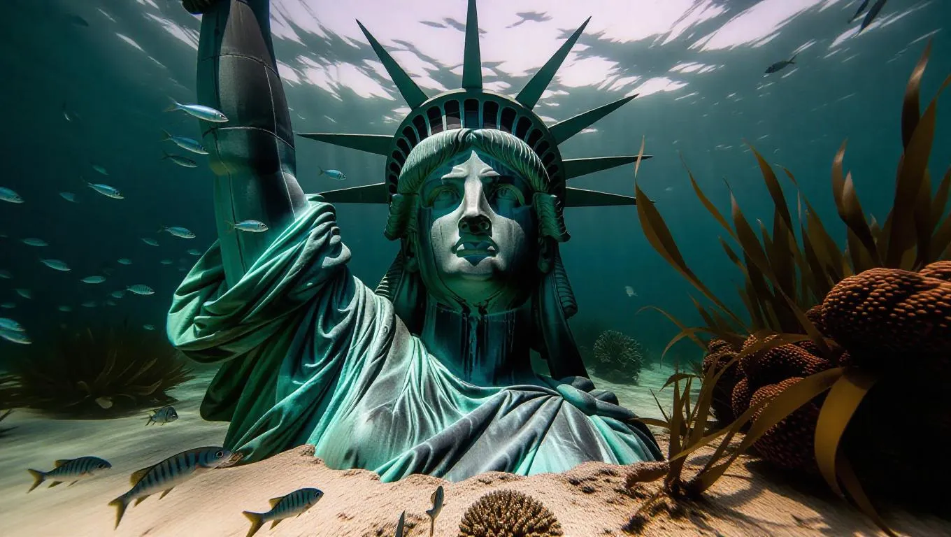 Rising from the dark, sandy ocean floor, a colossal, hyper-realistic Statue of Liberty bursts forth from the depths, her copper-green patina glistening with seawater droplets, as schools of iridescent fish dart past her majestic, stone-like face, while delicate seaweed tendrils sway in the gentle currents, surrounding her pedestal, a sunken, ancient temple-like structure overgrown with coral and anemones, in a breathtaking, wide-angle shot.