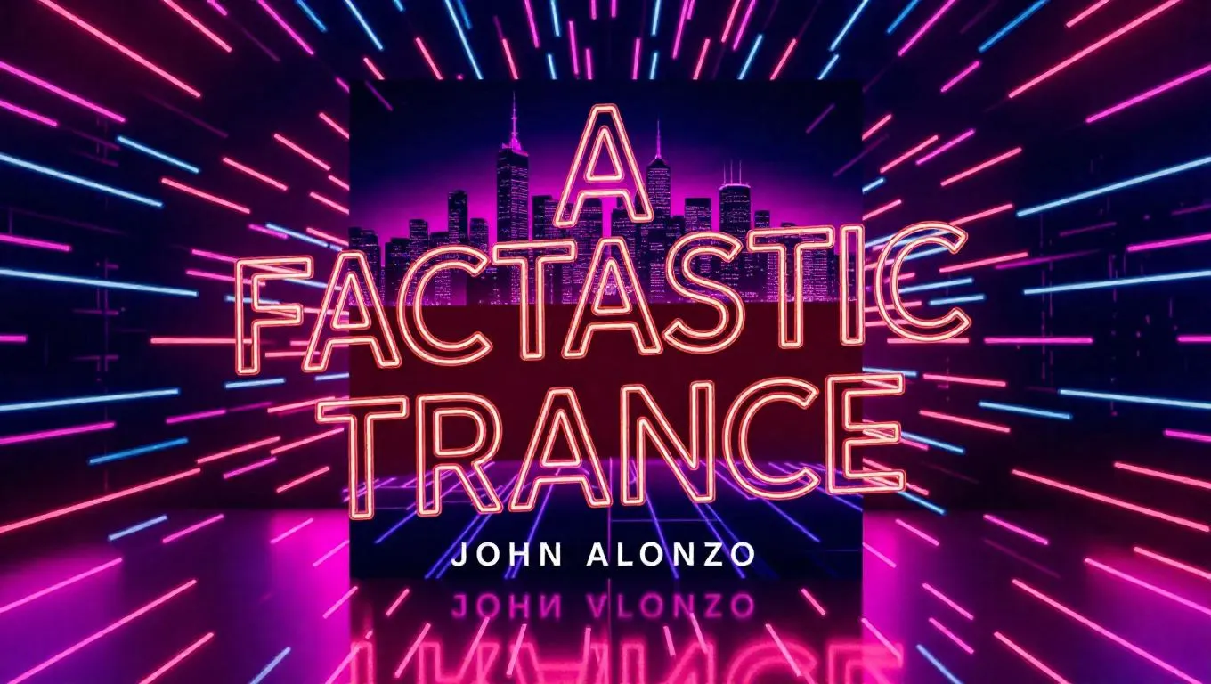 "A Fantastic Trance" by John Alonzo, displayed in vibrant neon text on a music album cover, with pulsing lights and dynamic visual effects. The background features a futuristic cityscape at night, illuminated by neon signs and glowing streaks of light, creating a high-energy, trance EDM atmosphere that maximizes engagement, views, virality, and earning potential.