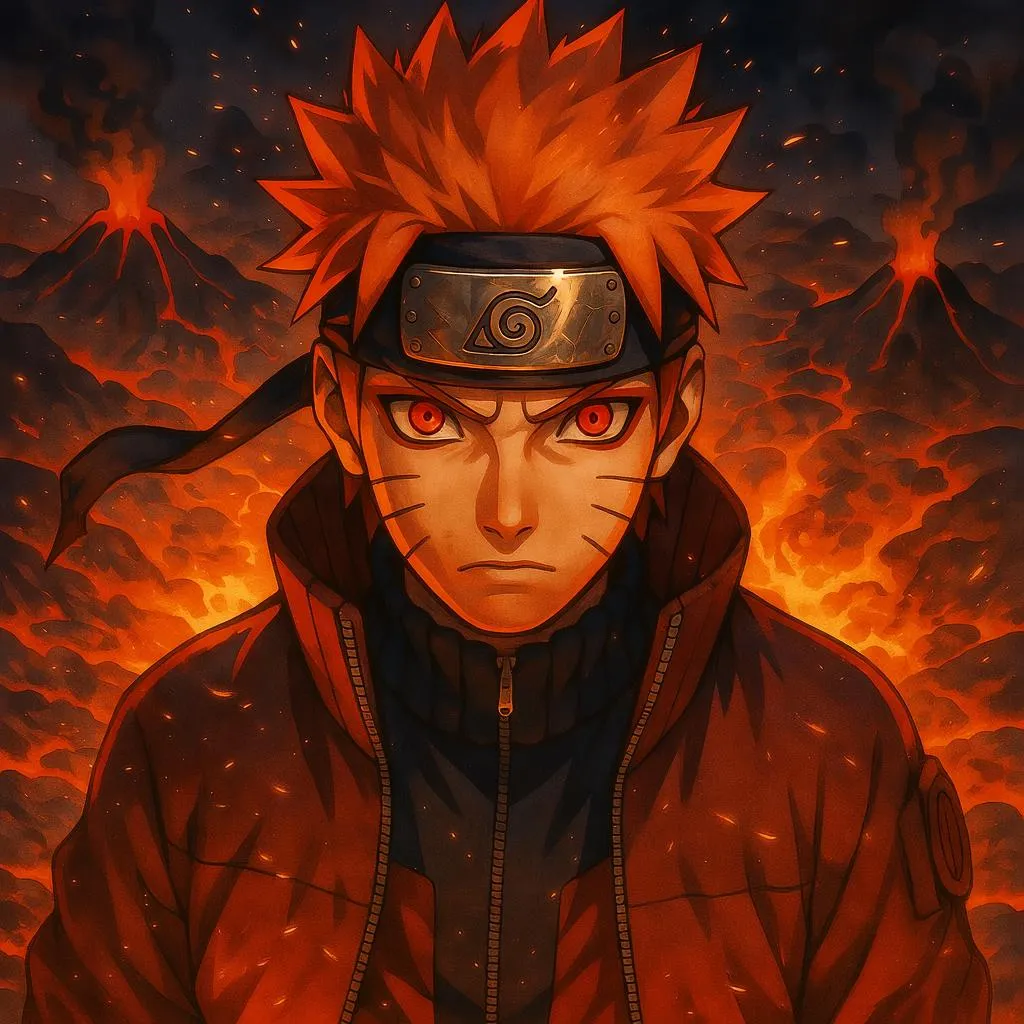 Create dynamic anime-style illustrations with a fiery Naruto-inspired protagonist in a fantasy realm. AI-generated art featuring glowing lava flows, smoking volcanoes, and vibrant light effects. Perfect for vibrant character designs with fiery red eyes, flaming hair, and ancient symbols. Transform text into professional-grade visuals with Vivago.ai's AI image generator.