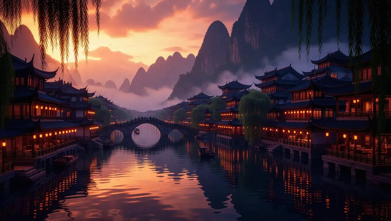Experience AI-generated ancient Chinese splendor with bustling riverside markets, silk-robed nobles, and mist-draped willow rooftops. Anime-style shimmering canals, lotus-filled lakes, and lantern-lit pavilions blend traditional ink aesthetics with modern vibrancy. Vivago.ai crafts dreamscapes where poets, dancers, and golden osmanthus blooms thrive under sunset clouds—redefining tradition through New Chinese Style artistry.