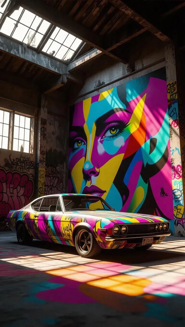 Vivago.ai transforms prompts into stunning AI art: surreal abandoned factory with vivid graffiti murals blending geometric patterns and mythical figures. Octane rendering highlights weathered textures, rusted metal, and dramatic sunlight contrasts. Create professional-grade visuals with vibrant colors, intricate details, and balanced decay-art fusion. Ideal for generating gritty urban art with AI-powered precision.
