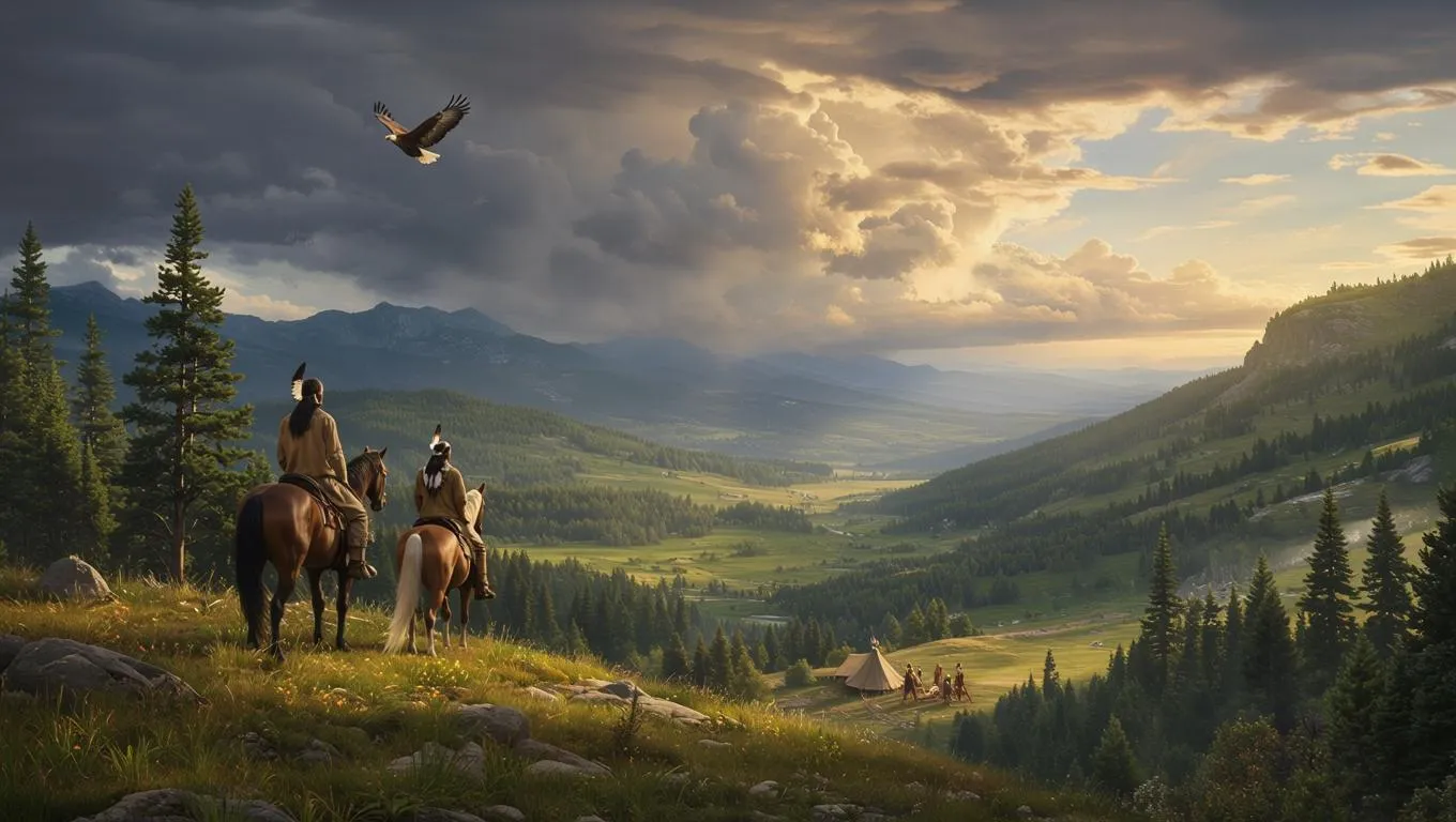 A valley enveloped by wooded hills, with an Indian man and woman mounted on horses atop one hill, gazing down at an Indian tribe camp below. An eagle soars overhead, while clouds in the sky resemble their ancestors, whispering guidance. A distant storm brews from the east, casting a dramatic backdrop. The scene is bathed in warm, soft light, with side lighting enhancing the textures of the landscape and the figures. The style is realistic, capturing the serene yet tense atmosphere.