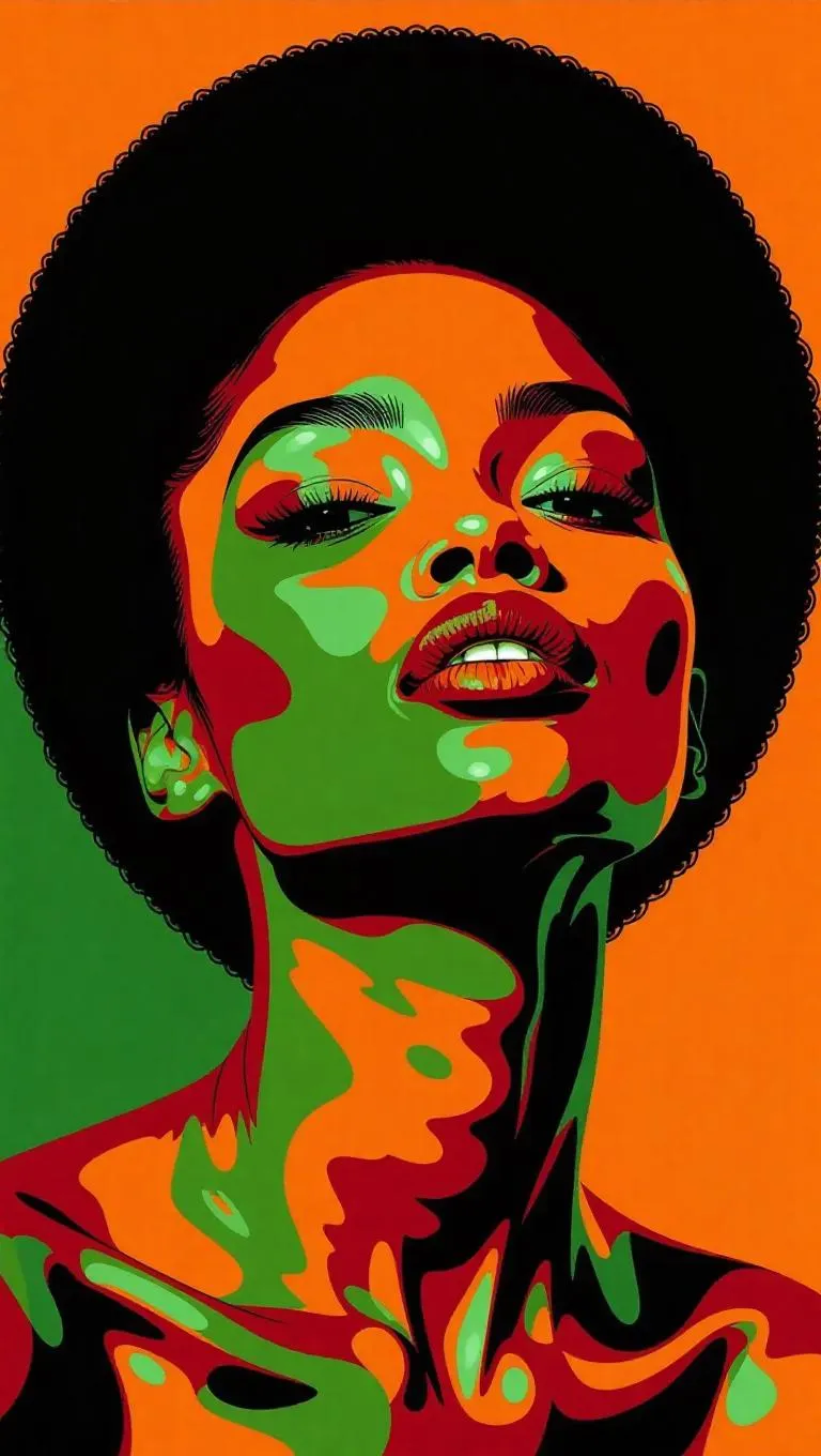 Transform text to vivid pop art portraits with AI. Generate an elegant pop art image of a black woman featuring a short afro, rendered in beautiful shades of brown, green, and orange. Create dynamic, professional AI artwork instantly.