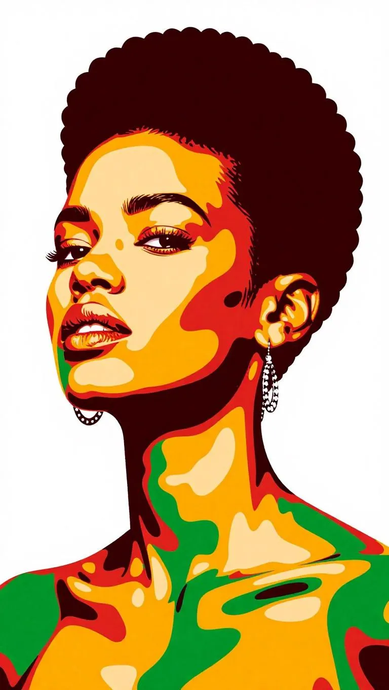 Transform text to vivid pop art portraits with AI. Generate an elegant pop art image of a black woman featuring a short afro, rendered in beautiful shades of brown, green, and orange. Create dynamic, professional AI artwork instantly.