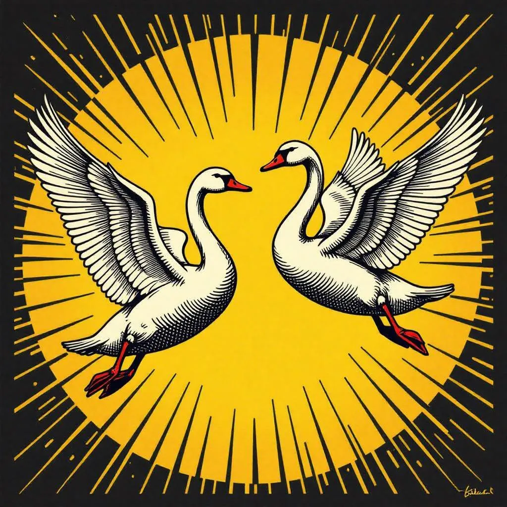Generate AI flying swans in a war comic book scene. Lichtenstein pop-art style with ballpoint pen cross-hatching, sepia tones, and penciled drawing precision. Inspired by Emil Ferris. Create professional AI art from text.