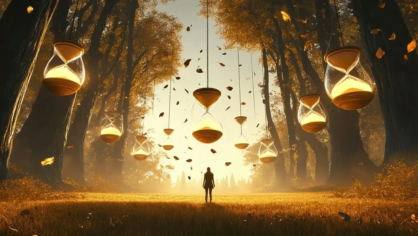 Create surreal AI-generated anime artwork with Vivago.ai's cinematic tools. Visualize time-reversed pendulums, glowing hourglasses, and a serene traveler in a mystical golden clearing. Watercolor effects enhance this wide-angle scene blending day/dusk skies. Transform prompts into professional anime-inspired visuals effortlessly.